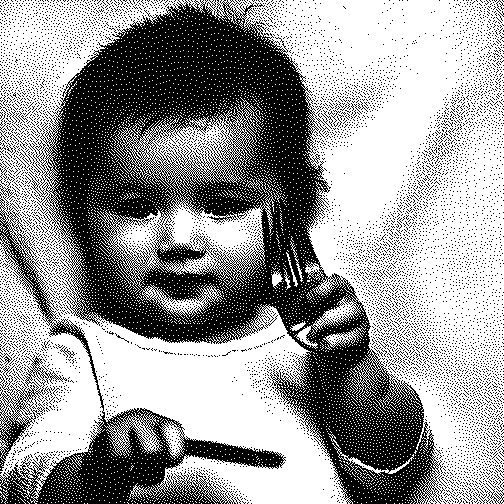 A baby with a fork maintains paragraph-sized items of various kinds.